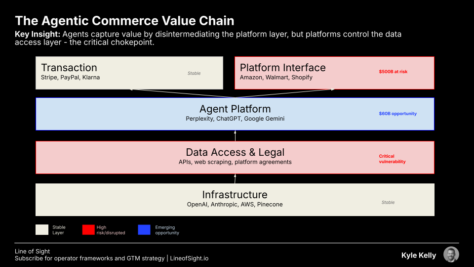 In agentic commerce, this layer is being disintermediated. Instead of being the primary destination, it becomes another data source for agents to query. Value capture is threatened as agents bypass advertising and drive purchases based on user preference, not paid placement.