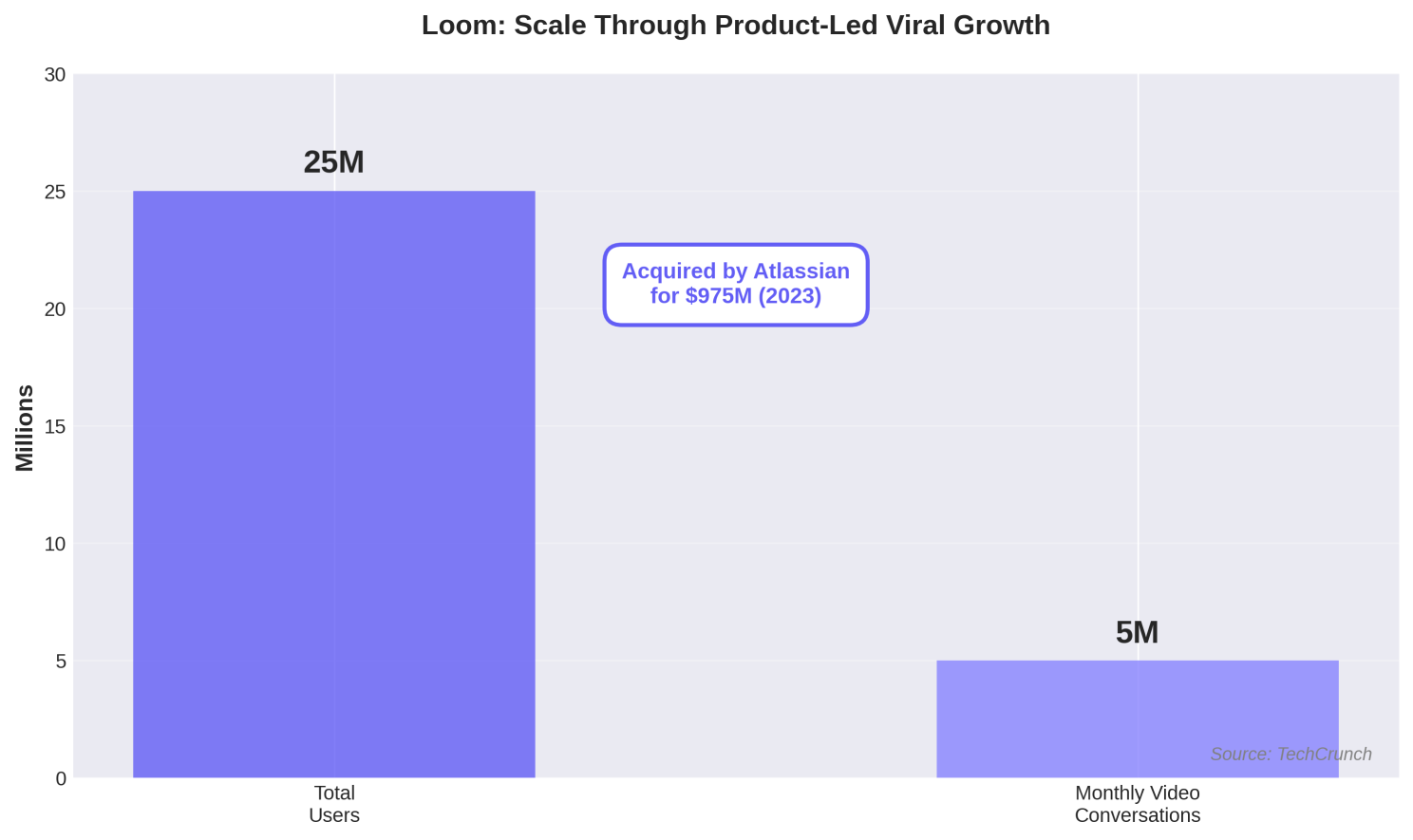 When a user receives a Loom video, they often sign up to reply with their own video, creating a natural viral loop. This bottom-up adoption allowed Loom to achieve massive scale and a $975 million acquisition by Atlassian in 2023, all by building distribution into the core user action [5].