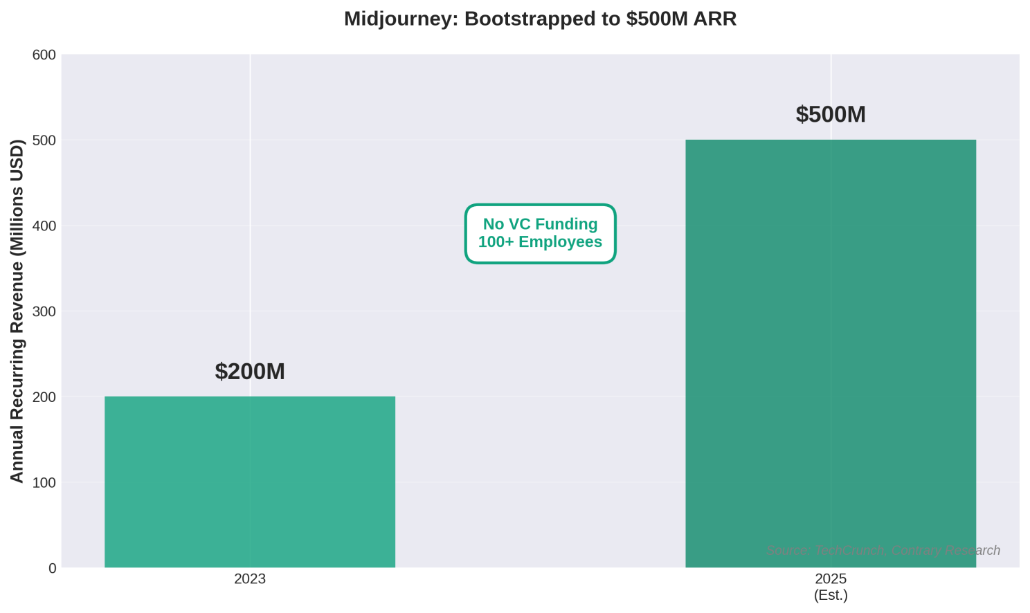 Midjourney, the AI image generator, reached $200 million in revenue by 2023 and is estimated to be operating at $500 million in annual recurring revenue as of 2025, all with a team of just over 100 employees and no VC funding [2][3]. Their masterstroke was building their entire user experience within Discord. This was not a technical shortcut; it was a strategic decision to build a community-as-infrastructure.