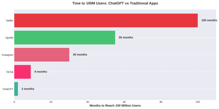ChatGPT’s growth was unprecedented. It reached 100 million monthly active users in just two months, a milestone that took TikTok nine months and Instagram two and a half years [1]. This was not achieved through a massive marketing budget, but because the product itself was the marketing campaign.