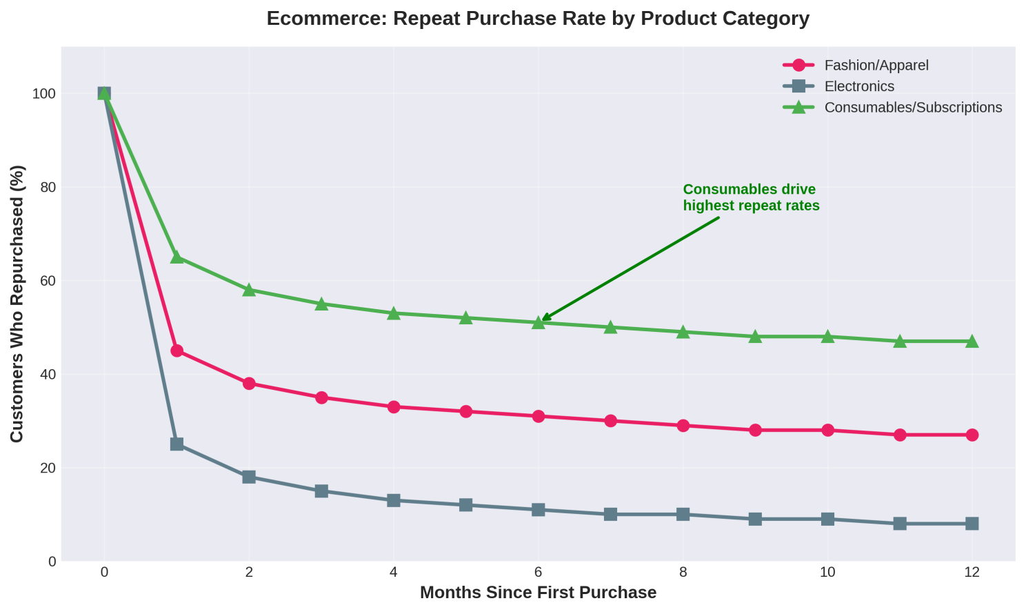 Customers who buy consumables (like coffee or vitamins) have a much higher repeat purchase rate than those who buy electronics. This may seem obvious, but quantifying it helps you decide where to focus marketing spend. The takeaway: prioritize markets where natural repeat behavior compounds.