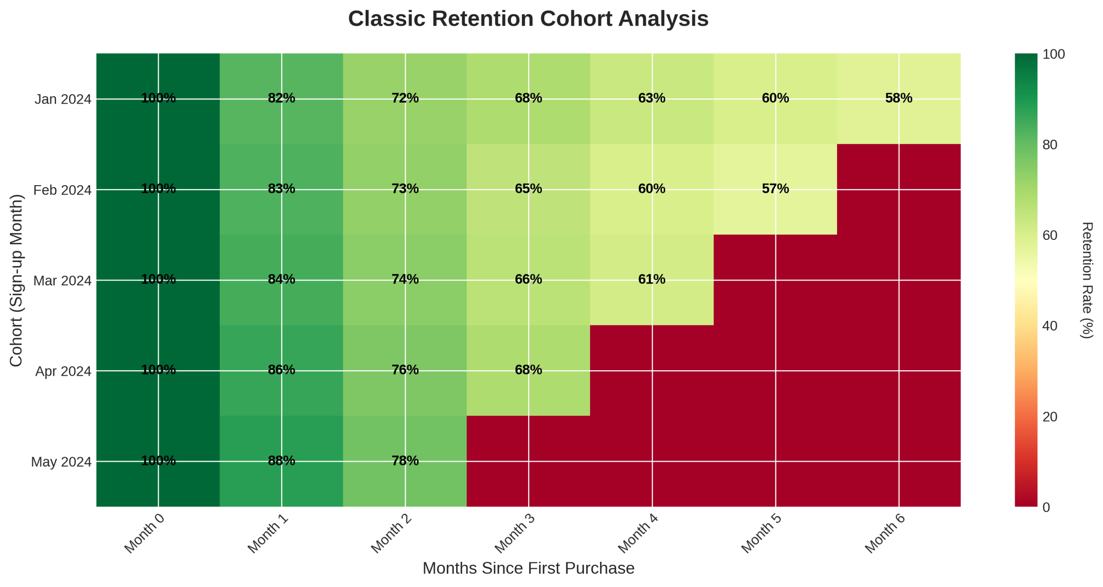 This chart shows the percentage of customers from each monthly cohort who are still active over time. You can see the January cohort started strong, but the May cohort had better retention in its first few months. Why? That’s the question that leads to strategic insights.