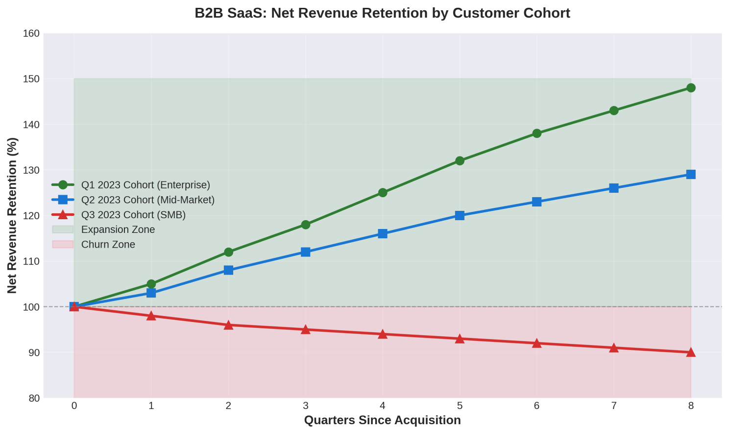 The Enterprise cohort expands steadily. The Mid-Market cohort grows more slowly. The SMB cohort churns, with revenue declining over time. This tells you to focus your sales and marketing on enterprise customers and fix the product or pricing for SMBs.