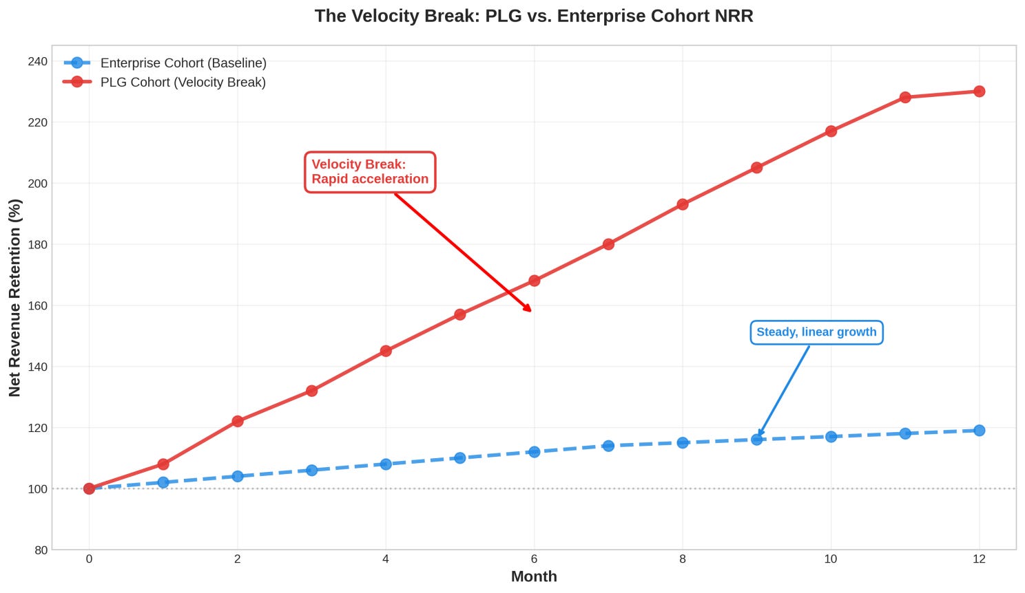 The enterprise cohort (in blue) has solid net revenue retention (NRR). It grows steadily over time. But the new PLG cohort (in red) is a rocket ship. Its NRR explodes after a few months. This is a velocity break. A velocity break is when a key metric, like NRR, suddenly accelerates. It’s a sign you’ve found a new, more efficient growth engine.