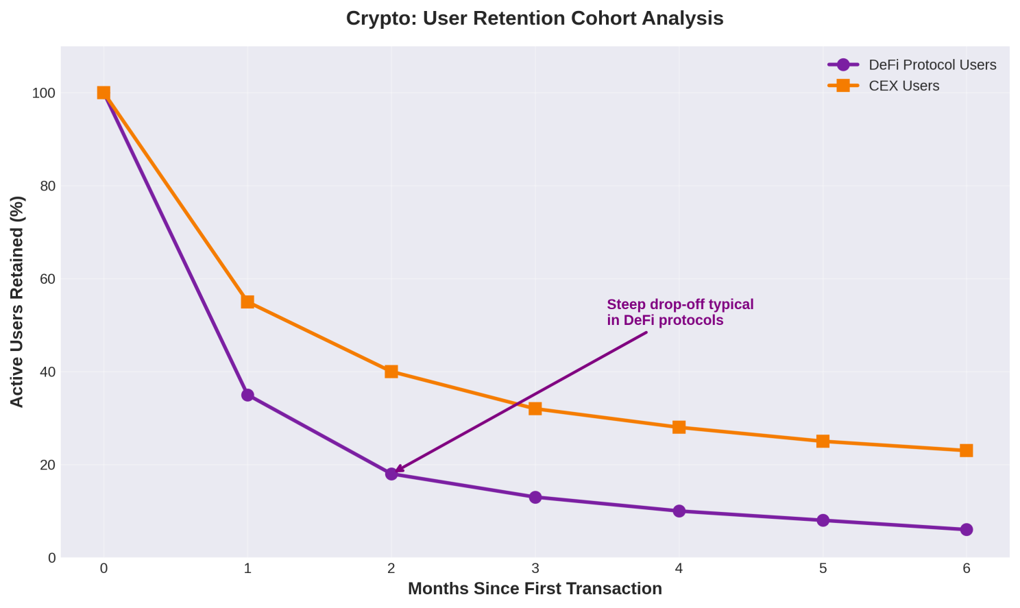 Here, users acquired through a centralized exchange (CEX) have significantly better retention than users who come directly to a DeFi protocol. That might suggest that CEX users are more committed or better educated. The signal is to invest in the cohorts that sustain engagement, not just those that drive sign-ups.