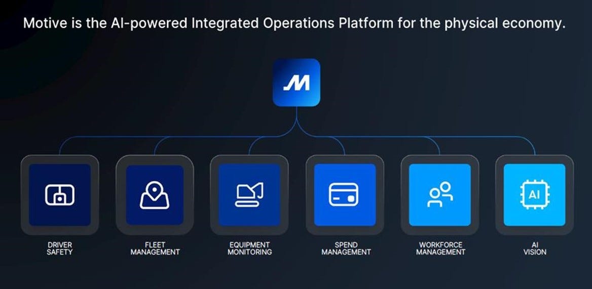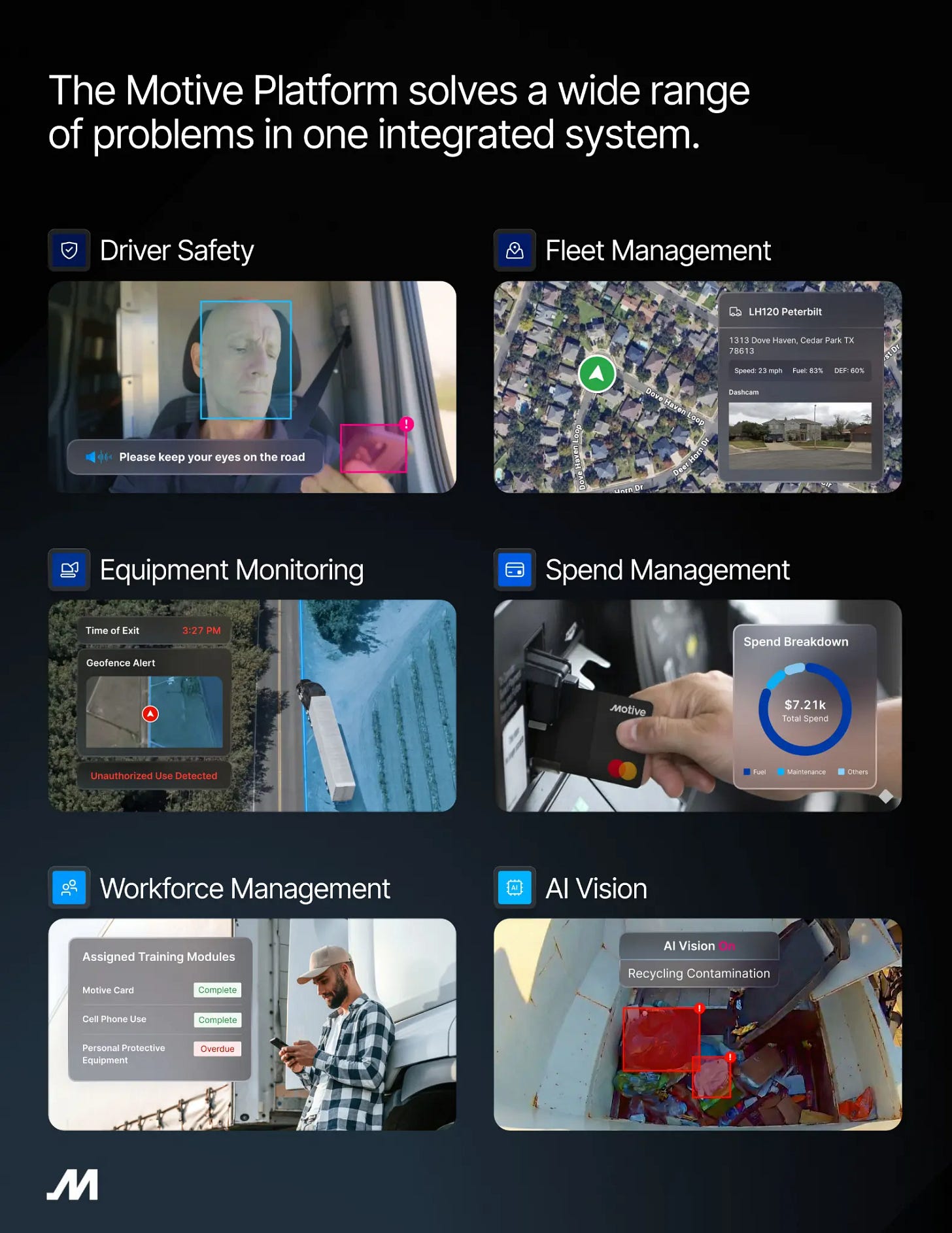 The platform architecture is deceptively simple: six interconnected modules (Driver Safety, Fleet Management, Equipment Monitoring, Spend Management, Workforce Management, and AI Vision) that share a common data foundation. This integration is the key differentiator. Rather than forcing customers to stitch together point solutions from multiple vendors, Motive provides a single pane of glass for physical operations.