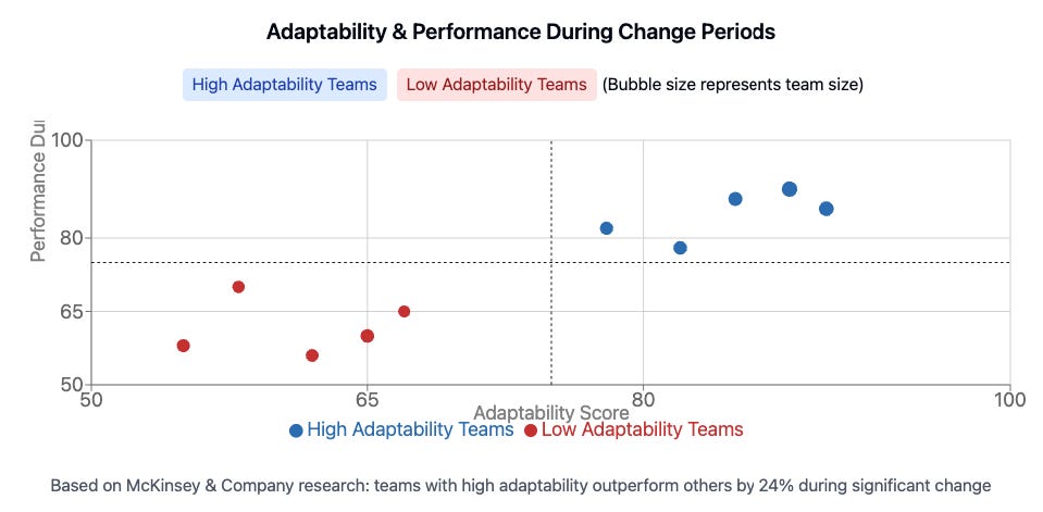 “Research across 150 organizations found that teams with high adaptability scores outperformed their less adaptable counterparts by 24% during periods of significant change.” — McKinsey, Organizational Resilience Study (2023)