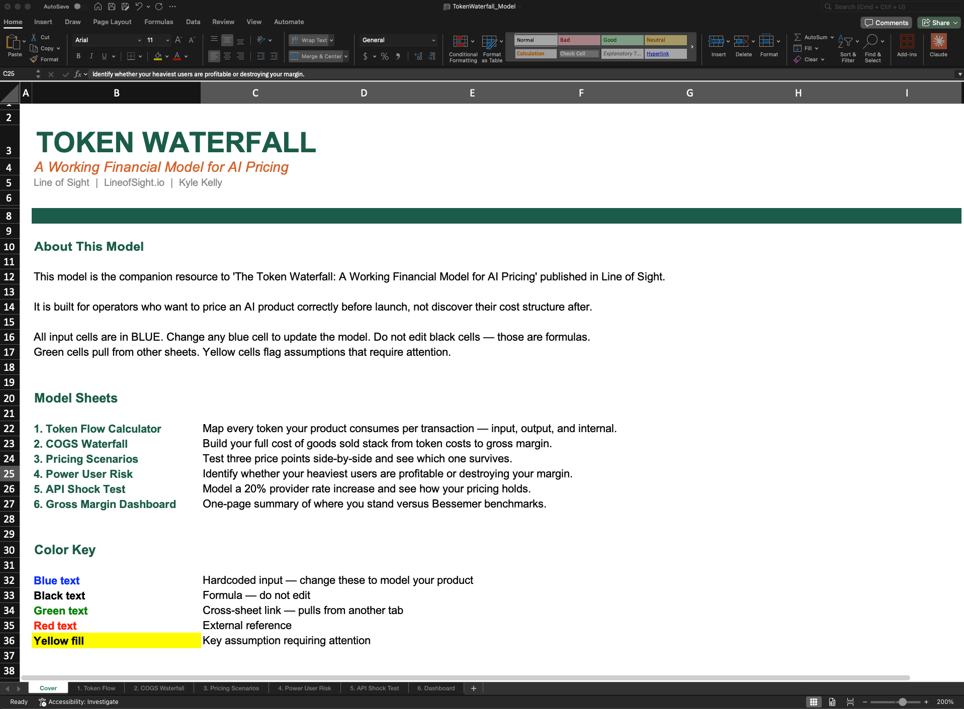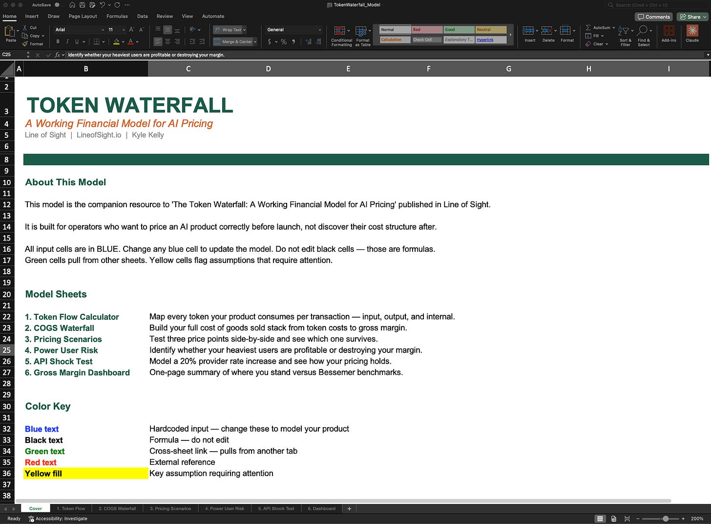 What follows is a walk-through of the Token Waterfall Model: a six-sheet working financial model built specifically for AI operators who need to price a product before launch, not discover their cost structure after. Every number in this article maps directly to a cell in the model. Open both. Work through them together.