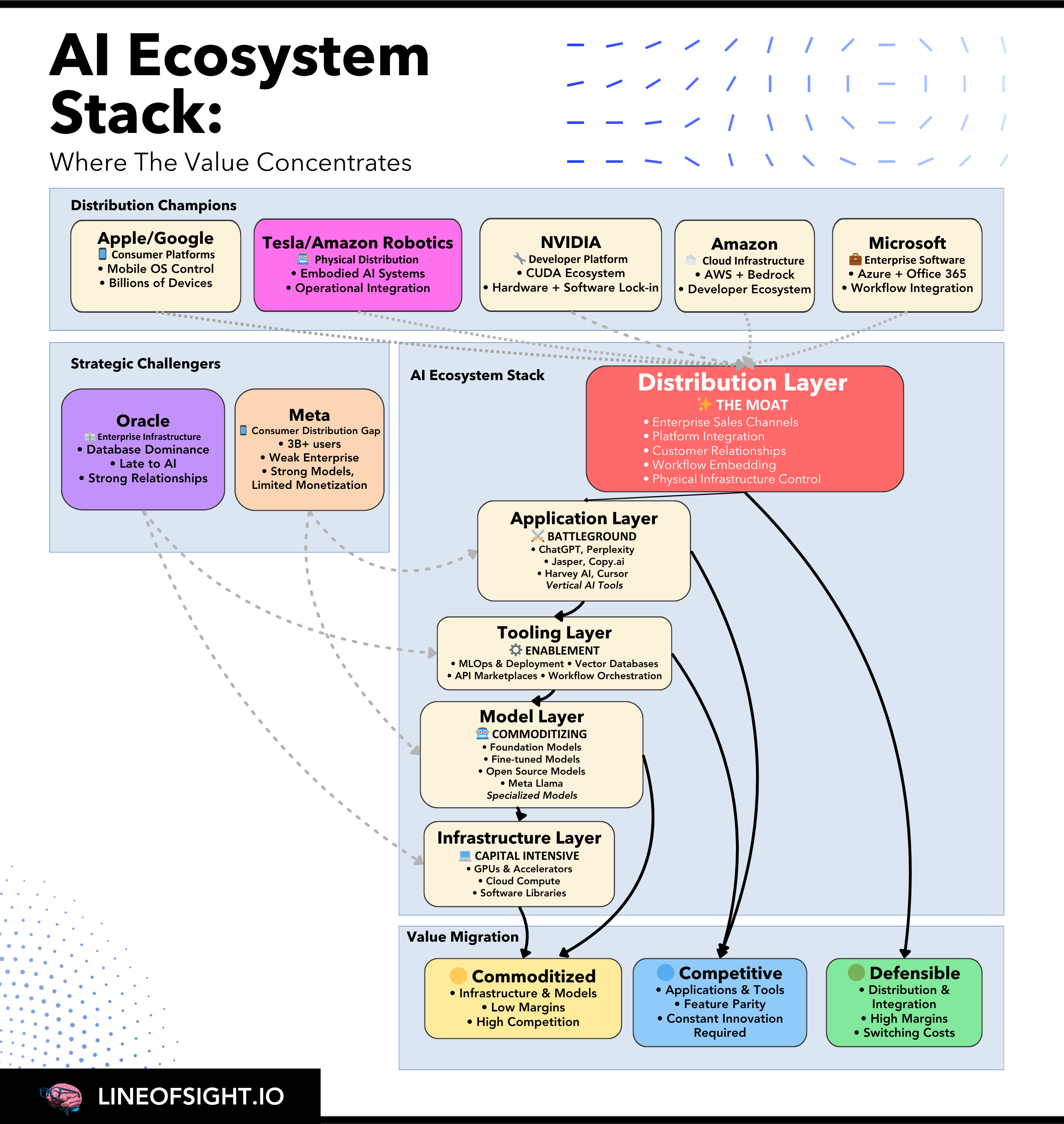To understand why distribution creates the ultimate defensible advantage, we must dissect the AI ecosystem into its constituent layers. Each layer represents distinct competitive dynamics, and as we move up the stack, we see clear value migration away from commoditized infrastructure toward defensible distribution channels.